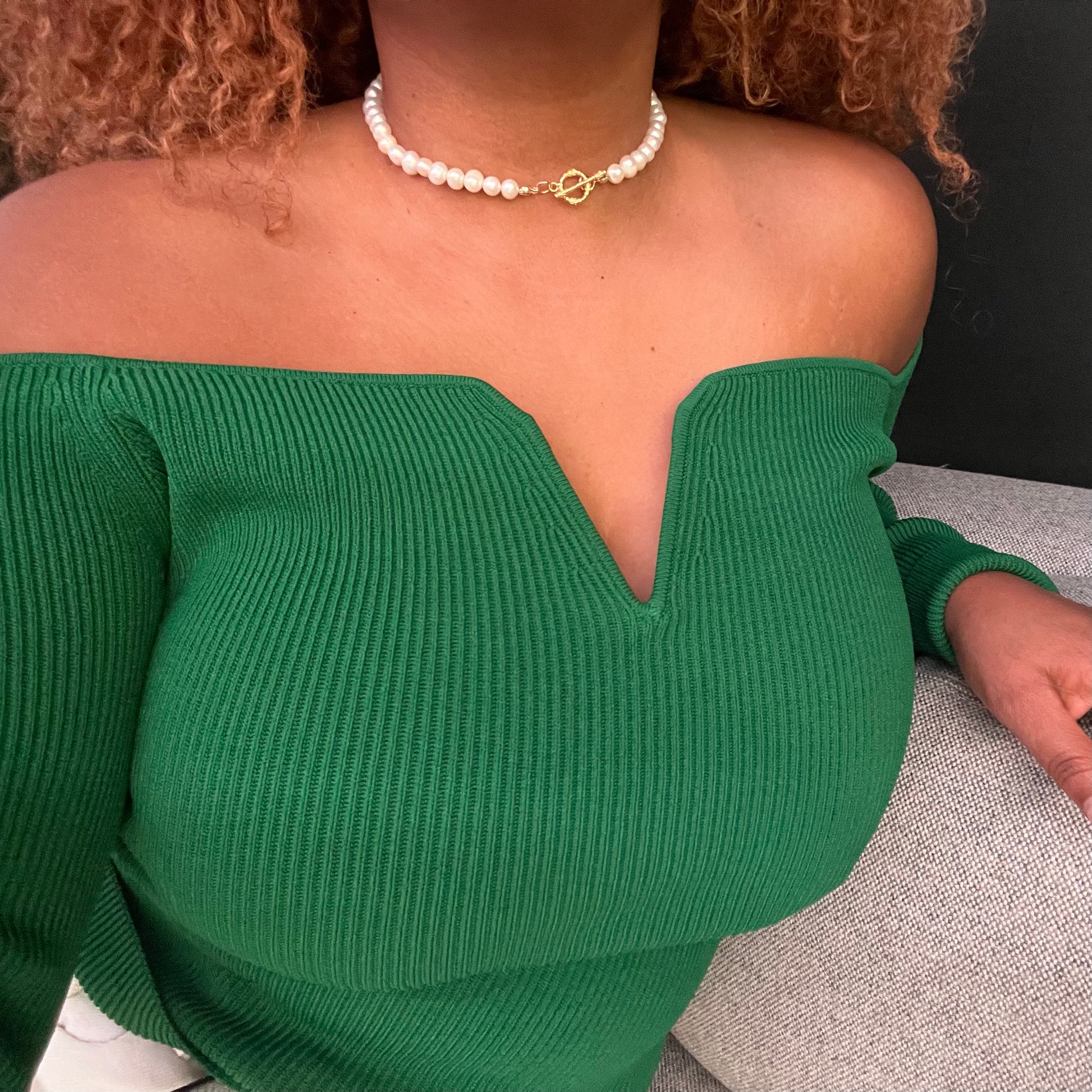 Our Béatrice Freshwater Pearl choker necklace featuring two closures a T-bar and Chunky push clasp in 18K yellow gold plated. Ideal for layering with a chain, necklace or solo. Finished with a toggle closure in the front.